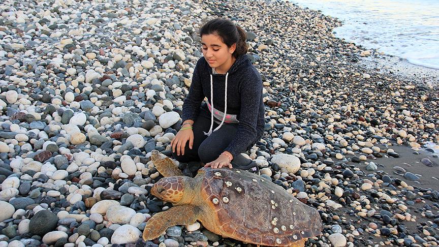 Alınan bilgiye göre, 11 yaşındaki Tuana Karasu, sahilde gezerken bir caretta carettanın karaya vurduğunu gördü.