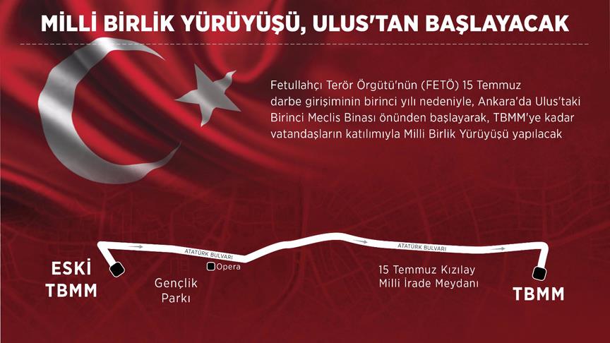 Fetullahçı Terör Örgütü'nün (FETÖ) 15 Temmuz darbe girişiminin birinci yılında Ankara'da düzenlenecek "Milli Birlik Yürüyüşü", Ulus'taki Birinci Meclis binası önünden başlayıp TBMM'de son bulacak.