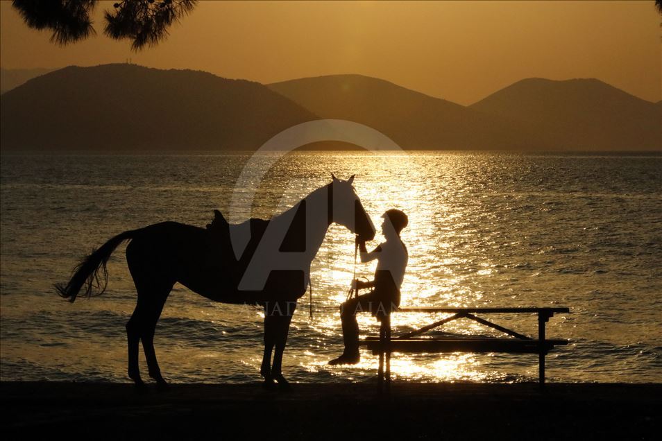 Nevşehir Jandarma At ve Köpek Eğitim Merkezi Komutanlığından getirilen "Başak", "Ayperi" ve "Ülkem" isimli atlar, Aydın'ın Kuşadası ilçesinde göreve başladı. Atlı timlerin gün batımındaki anları ise güzel görüntü oluşturdu. ( Ferdi Uzun - Anadolu Ajansı )