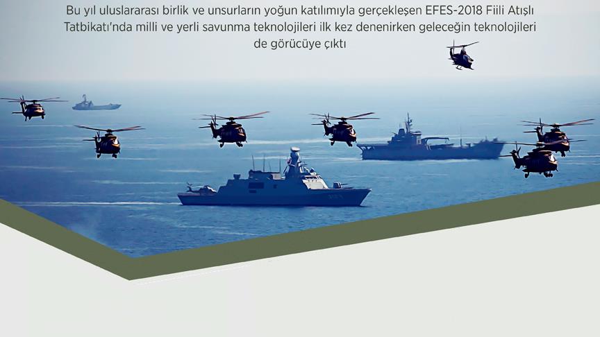 Bu yıl yüksek düzeyde uluslararası katılımla gerçekleşen Efes-2018 Fiili Atışlı Tatbikatı, Türkiye'nin milli harp teknoloji ve ürünlerini başarıyla test ettiği, geleceğin teknolojilerini ise görücüye çıkardığı bir organizasyona sahne oldu.