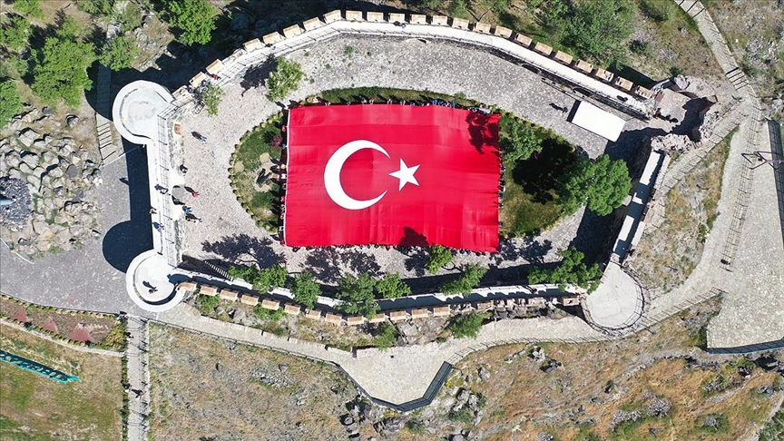 Tarihi kalede surların arasında açılan uzunluğu 22 metre, eni 15 metre ebadındaki bayrak, güzel görüntü oluşturdu.