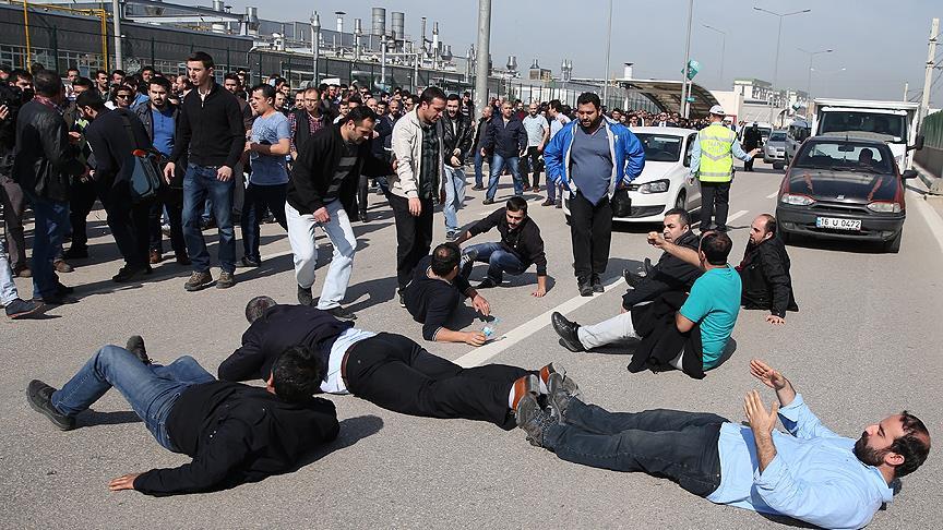 Birleşik Metal İş Sendikasına üye 10 işçinin işten çıkarılmasını protesto etmek ve arkadaşlarına destek olmak amacıyla Bursa-Mudanya karayolundaki fabrika önünde toplanan bir grup işçi, yolu trafiğe kapatmak istedi.