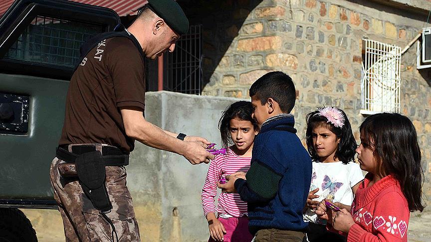 Diyarbakır'ın Hazro ilçesinde görev yapan özel harekat polisleri devriye gezerken karşılaştıkları çocuklara özel ilgi gösteriyor.