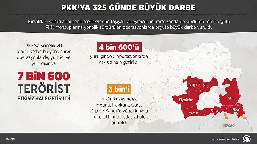 Geçen yılın temmuz ayından bu yana Muş, Mardin, Diyarbakır, Şırnak, Hakkari, Van, Bingöl ve Irak'ın kuzeyi başta olmak üzere düzenlenen operasyonlarda etkisiz hale getirilen terörist sayısı yaklaşık 7 bin 600 oldu.