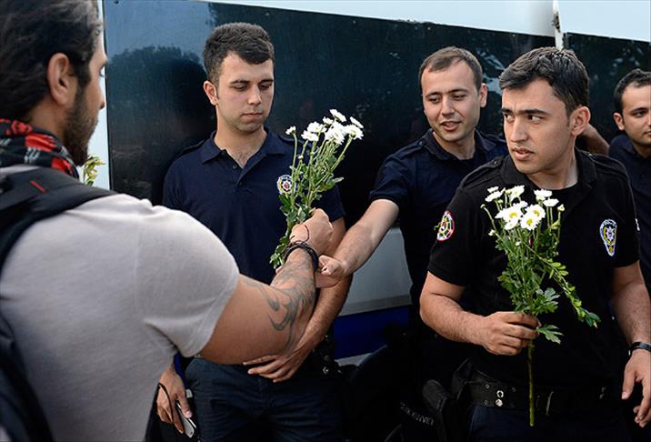 Taksim Meydanı ve Gezi Parkı'nda eylemcilerin sakin bekleyişi sürerken, bazı eylemciler polislere çiçek takdim etti.