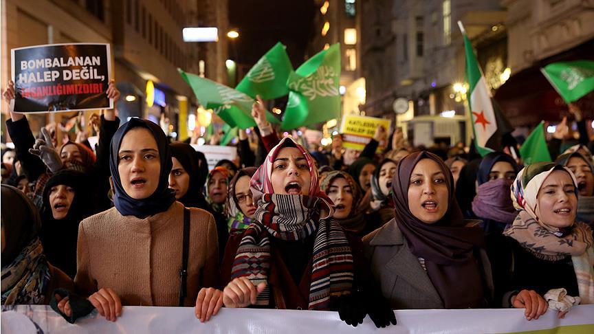"Esed, İran, Rusya Şer İttifakına Karşı Direnen Halep'in Yanındayız" pankartı açan gruptakiler, "Katledilen Halep Değil Onurumuzdur", "Katledilen Halep Değil İnsanlığımızdır" dövizleri taşıdı.