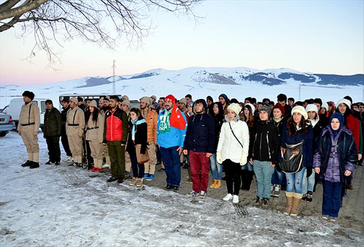 Kars yolundaki Sarıkamış Allahu Ekber Şehitleri Anıtı'na yürüyen gruptan asker kıyafeti giyen 20 öğrenci, saygı duruşunda bulunulup ve İstiklal Marşı'nın okunmasının ardından nöbet tutmaya başladı.