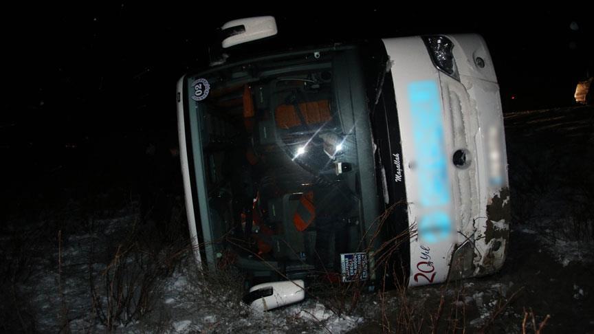 Alınan bilgiye göre, Konya'nın Ereğli ilçesinden Erzurum'a giden Mehmet Aydınlı (61) yönetimindeki 42 E 5407 plakalı yolcu otobüsü, Sivas-Kayseri karayolunun Gemerek ilçesi Karagöl köyü mevkisinde buzlanma nedeniyle kayganlaşan yolda devrildi.