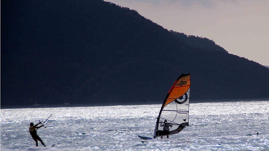 Güney Ege'nin gözde turizm merkezlerinden Marmaris'te lodoslu havayı fırsat bilenler deniz üzerinde rüzgar ve uçurtma sörfü yaptı.