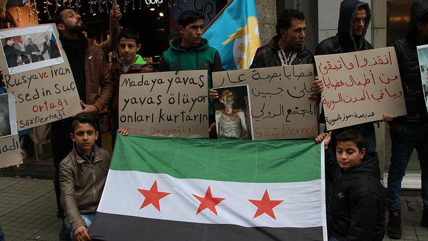 Rusya'nın İstanbul Başkonsolosluğu önünde toplanan Suriye Türkmen Meclisi ve Suriye SÖZ Derneği üyeleri, "Suriye ağlama, Türkiye seninle", "Madaya yavaş yavaş ölüyor, onları kurtarın" ve "İnsanlık kalmadı" yazılı dövizler taşıdı. Üzerine çarpı işareti konulmuş Suriye Devlet Başkanı Beşşar Esad ile Rusya Devlet Başkanı Vladimir Putin'in fotoğraflarının da yer aldığı eylemde, Suriye'de yaşamını yitirenler için 1 dakikalık saygı duruşunda bulunuldu.