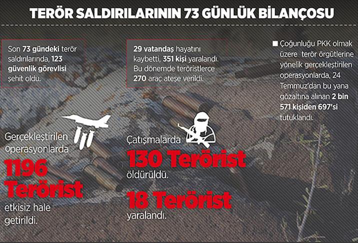 AA muhabirinin derlediği bilgiye göre, son 73 gündeki (7 Temmuz-17 Eylül) terör saldırılarında 123 güvenlik görevlisi (asker, polis ve korucu) şehit edildi, biri İran uyruklu 29 kişi hayatını kaybetti, 3'ü İran uyruklu 351 kişi yaralandı.