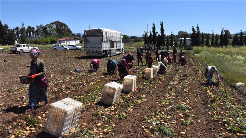 Datça'da tarım işçileri, sabahın erken saatlerinden itibaren patates hasadı için tarlalara gidiyor. Traktör yardımıyla çıkartılan patatesler, topraktan arındırılıp selelere daha sonra kasalara doldurularak tarlada bekletilen kamyonlara yükleniyor.