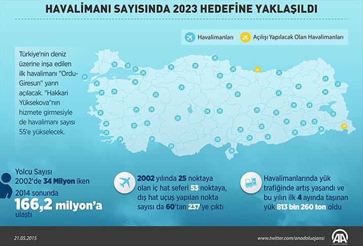 Türkiye'deki havalimanı sayısı 12 yılda 26'dan 53'e yükseldi. Yarın Ordu-Giresun, 26 Mayıs’ta ise Hakkari Yüksekova'nın açılmasıyla hizmet verilen havalimanı sayısı 55 olacak. Öte yandan Antalya'nın batısı Demre, Kaş ve Finike bölgesine havalimanı yapımı için çalışmalara başlandı.