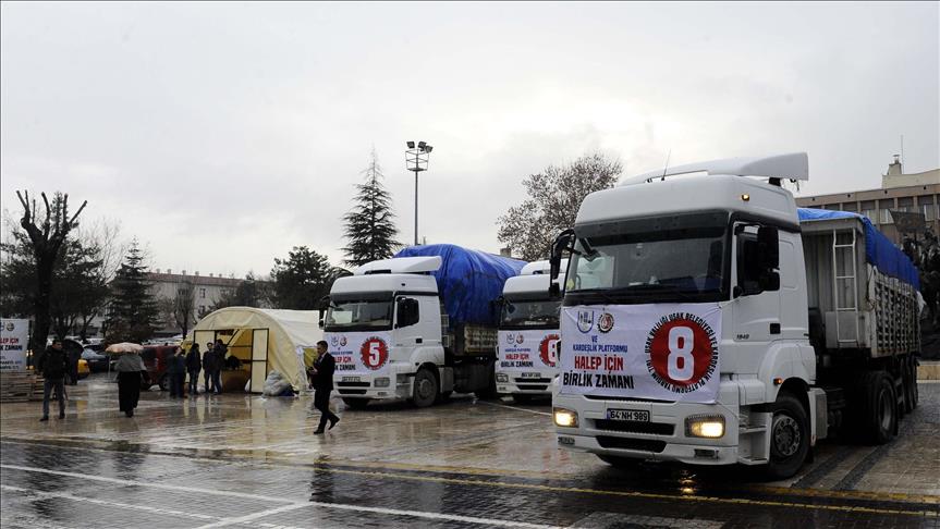 Halep'ten tahliye edilen siviller için Uşak'ta düzenlenen yardım kampanyasında toplanan gıda ve ihtiyaç malzemelerini taşıyan tırlar yola çıktı.