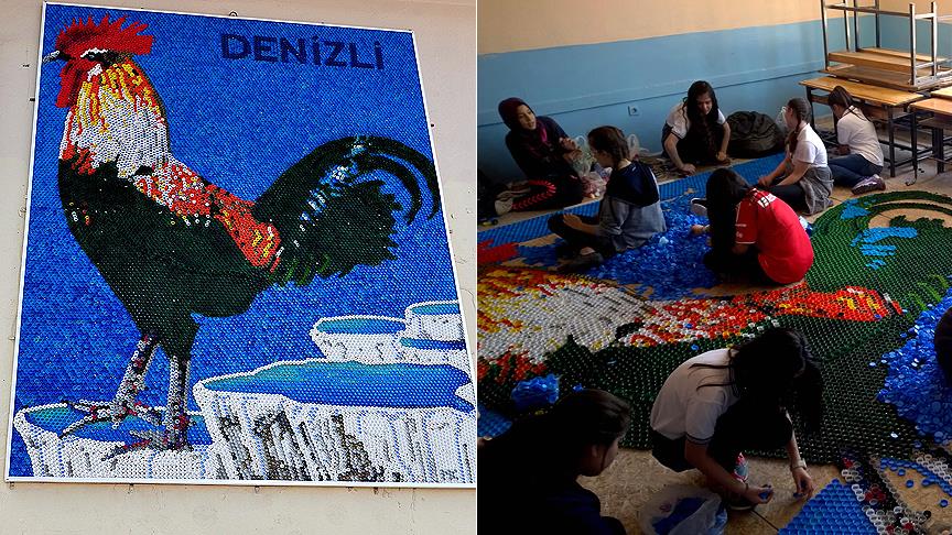 Denizli'de ortaokul öğrencileri, topladıkları 38 bin atık pet şişesi kapaklarını kullanarak Pamukkale travertenleri üzerinde duran horoz figüründen oluşan mozaik yaptı.