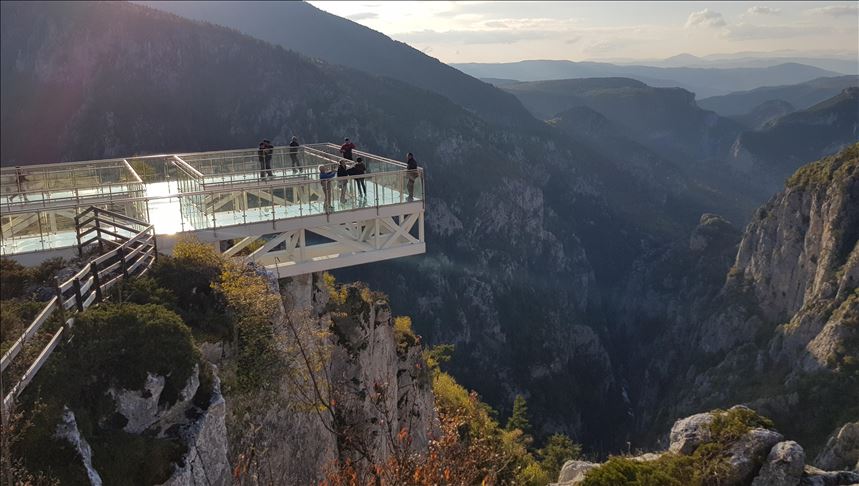 Kastamonu'nun Azdavay ilçesindeki Çatak Kanyonu'nda 450 metre yükseklikte kurulan cam teras, ziyaretçilerine sonbaharın renkleriyle bezenen doğanın güzelliğini seyretme imkanı sunuyor.