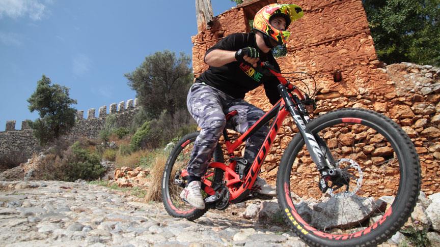 Alanya Kalesi başta olmak üzere ilçenin tarihi ve doğal güzellikleri arasında downhill yapan Kasapoğlu, bisiklet sürerken kaskında takılı kamerasıyla da çektiği görüntüleri sosyal medya aracılığıyla yayınlıyor.