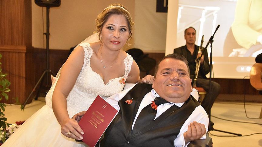 Bedensel engeli nedeniyle tekerlekli sandalyeye bağlı yaşayan 41 yaşındaki Vedat Ergüven, herhangi bir engeli bulunmayan Sibel Kahraman'la düzenlenen düğün töreniyle evlendi.