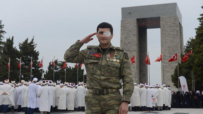 Karabağ'da girdiği bir çatışmada gözünü ve bacağını kaybeden Azerbaycanlı gazi Kamil Musavi, Afrin'deki Mehmetçik'e "şehitler diyarı"ndan destek verdi.