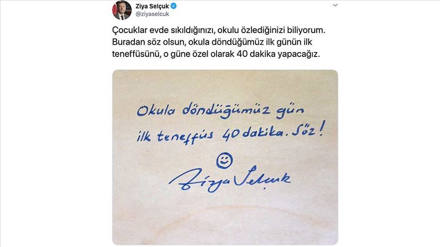 Ordu Büyükşehir Belediye Başkanı Mehmet Hilmi Güler, Twitter'da, Milli Eğitim Bakanı Ziya Selçuk'un "Çocuklar evde sıkıldığınızı, okulu özlediğinizi biliyorum. Buradan söz olsun, okula döndüğümüz ilk günün ilk teneffüsünü, o güne özel olarak 40 dakika yapacağız." açıklamasına yanıt verdi.