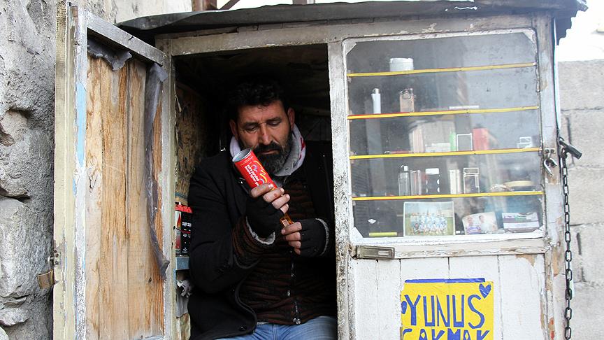 Van'ın Tuşba ilçesinde yaşayan 42 yaşındaki Suat Uyar, 17 yıl önce Demirciler Sokağı'nda kurduğu bir metrekarelik demir kulübede ekmek mücadelesi veriyor.