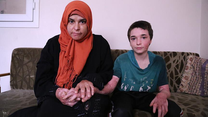 Esed rejimi güçlerinin Rusya'nın desteğiyle sürdürdüğü saldırılarda bombalanan evlerinde çıkan yangında vücutlarında ağır yanıklar oluşan Suriyeli anne ve oğlu, şifayı Türkiye'de arıyor.