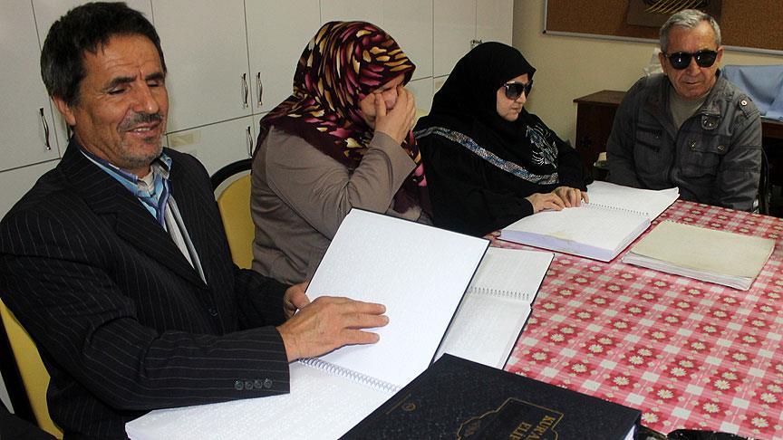 Eskişehir'de Odunpazarı Halk Eğitim Merkezinde açılan kursta görevli görme engelli eğitmen, kendisi gibi 13 engelliye Braille alfabesiyle Kur'an-ı Kerim eğitimi veriyor.