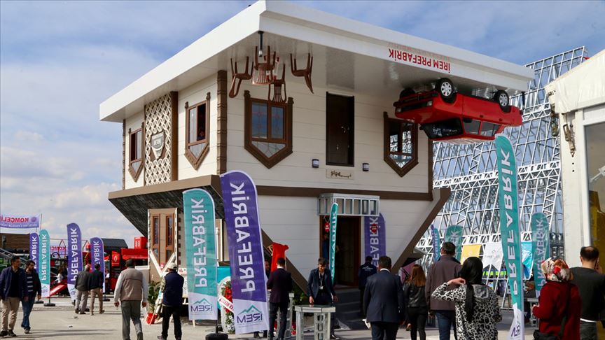Konya'da prefabrik imalatçısı tarafından yapılan iki katlı ters villa, farklı mimarisi ile Konya Tarım Fuarı'nda ziyaretçilerden ilgi görüyor.