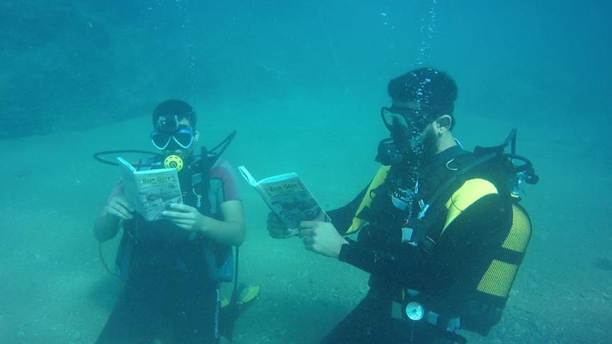 Merkezden Furkan Koca, Kağan Kürşatoğlu, İbrahim Koca ve Fatih Andaç, Mavi Akdeniz Su Sporları Kulübü iş birliğinde Lara Konserve Koyu'ndan kitapları ile dalış yaptı.