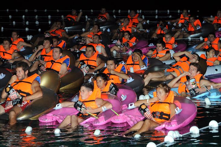 Antalya Konyaaltı Plajı'nda sahile kurulan sinema perdesinin karşısında denizin içinde oluşturulan özel alanda yerlerini alan gnçtrkcll'liler, denizdeki şambrellerin üzerine yerleşerek, film için yerlerini aldı.