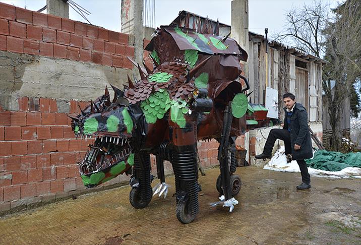 "Yaklaşık 120 gün boyunca aralıksız bir şekilde bu makine üzerinde çalıştım. Malzemeleri yağ tenekesi, çatı üstlerindeki saclardan elde ettim. Eski parçaları alarak geri dönüşüm yapıyorum. Özellikle dere kenarlarından teneke topladım. Sağdan, soldan bulduğum parçalarla bir araya getirdiğim bir makine oldu. Dinozorun üst bölümünde bulunan füzeatar kısmını soba borularından yaptım. Elimdeki imkan kısıtlı olduğu için bu tarz parçalarla çalışıyorum."