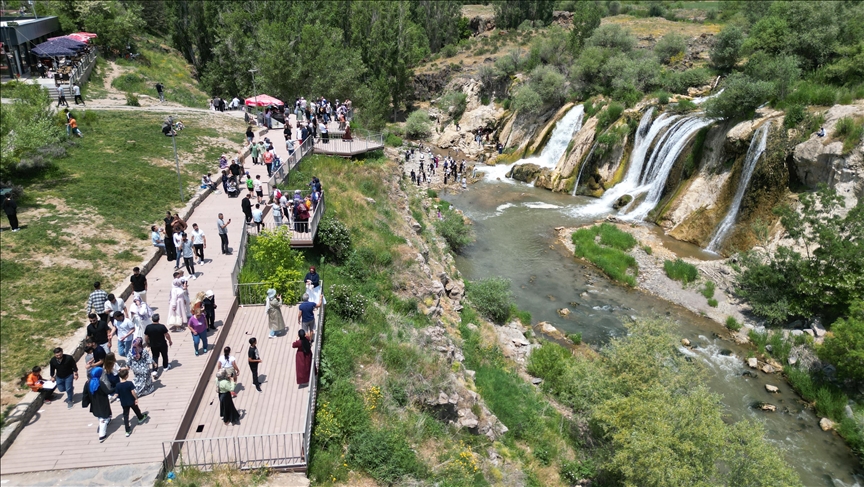 Anlık gelişmeler için AA Canlı Havanın ısınmasıyla canlanan doğasıyla büyüleyen şelaleyi ziyaret edenler, bölgede yürüyüş yaptı, asma köprü ve şelale önünde fotoğraf çekti.