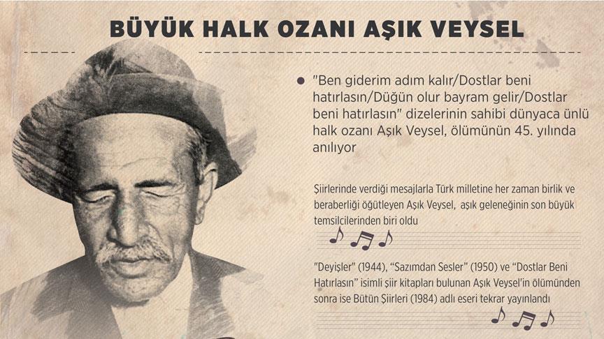 Ünlü halk ozanı Aşık Veysel Şatıroğlu, vefatının 45. yılında anılıyor.