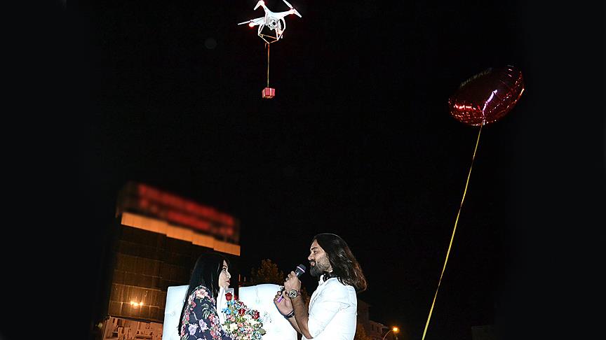 Karabük'ün Safranbolu ilçesinde bir genç, kız arkadaşına drone (insansız hava aracı) ile indirdiği yüzüğü vererek evlenme teklifi yaptı.
