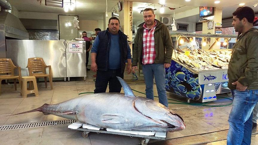İzmir'in Çeşme açıklarında balıkçıların ağlarına takılan 403 kilogram ağırlığındaki dev orkinos, Manisa'nın Turgutlu ilçesinde satışa sunuldu.