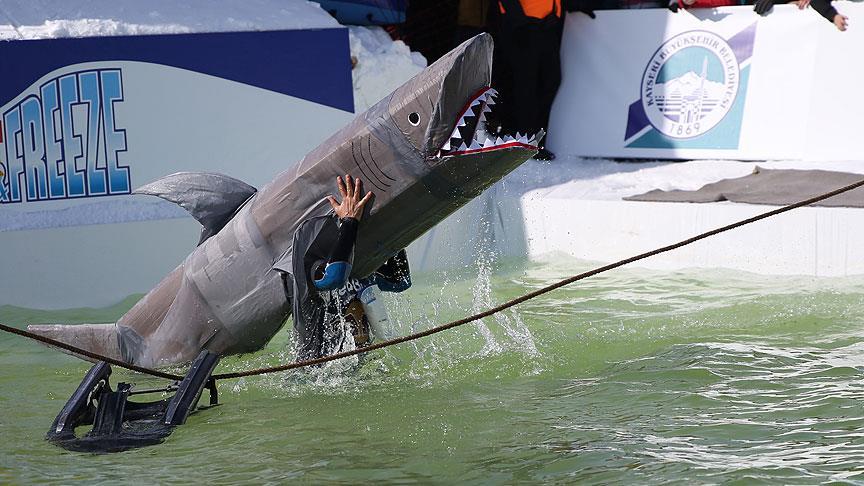 Erciyes Kış Sporları ve Turizm Merkezi Tekir Kapı Pisti'nde bir içecek firmasınca gerçekleştirilen etkinlikte 46 yarışmacı, ilginç kıyafetleriyle soğuğa aldırış etmeden içerisinde buz kalıplarının olduğu havuza atladı.