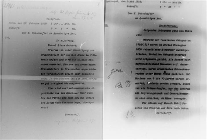 "Alman belgeleri ile Osmanlı belgeleri de birebir örtüşüyor, Türk arşivleriyle kıyasladım. Erzincan'da, Erzurum'da, Bitlis'te yapılan katliamlar yer alıyor. Alman savaş muhabiri Paul Weitz'nin yazısında da Ermeni çetelerince 1917'nin sonunda, özellikle Erzincan Mütarekesi'nden sonra Doğu Anadolu'da nasıl katliamlar yaptıklarını, nasıl insanlık dışı işkencelerle insanları katlettiklerini açık ve net yazıyor. Ermenilerin, Erzurum başta olmak üzere Erzincan'da, Bayburt'ta, Gümüşhane'de, Bitlis'te, Muş'ta, Van'da, Müslüman ahaliye karşı büyük katliamlar yaptıkları belgelerde yer alıyor. O belgeler, Osmanlı belgeleriyle örtüşüyor."