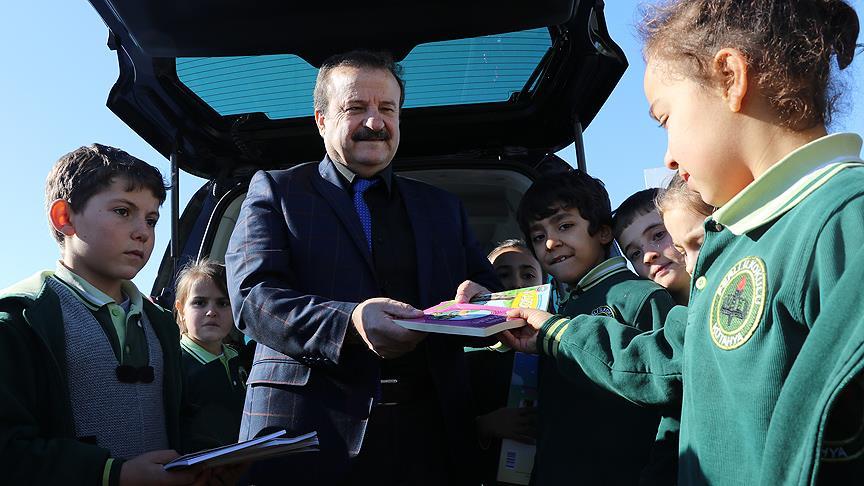 Bağışçılardan topladığı kitaplarla Türkiye genelinde 55 okulda kütüphane kuran emekli kütüphane memuru Zeki Aktürk, aracıyla Kütahya'daki köy okullarına gidip çocuklara kitap dağıtıyor.