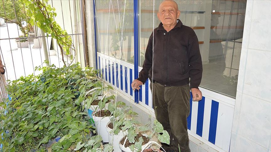 Samsun'un Havza ilçesinde 71 yaşındaki Tahir Şişli, bahçesi olmayınca "kova"larda sebze yetiştirmeye başladı.