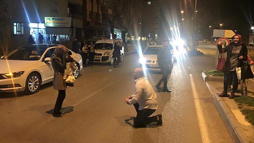 Çevredeki vatandaşların da desteğiyle Arıkan, ''evet'' cevabını aldıktan sonra kız arkadaşını yolun karşısında kapattığı restorana götürerek kutlamaya buradan devam etti.