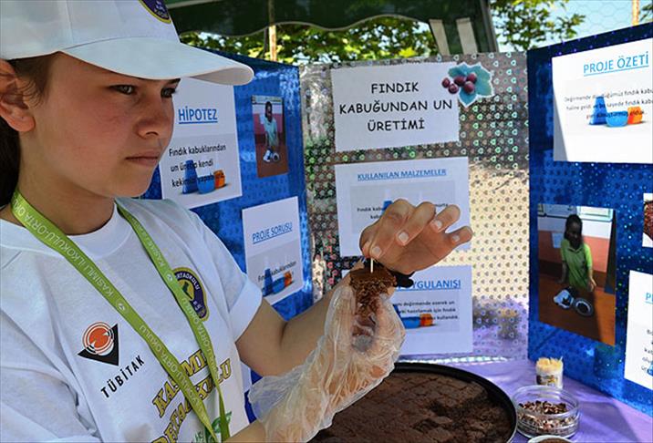 Alaplı Kasımlı Ortaokulu'nda düzenlenen TÜBİTAK 4006 Bilim Fuarı'na katılmak için hazırlık yapan 8. sınıf öğrencileri Safiye Demirtaş ve Melika Özcan, Fen ve Teknoloji öğretmeninin yönlendirmesiyle genellikle çöpe atılan fındık kabuklarının değerlendirilmesine yönelik proje geliştirdi.