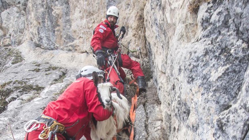 Çorum'da kayalık alanda 5 gündür mahsur kalan hamile keçi, Arama Kurtarma Derneği (AKUT) Ankara ekibinin 3 saatlik operasyonuyla kurtarıldı.