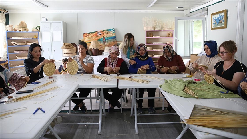 Kurs kapsamında oluşturulan atölyede buğday sapını işlemeyi öğrenen kadınlar, sepet, çanta, tepsi ve nihale gibi süs eşyaları tasarlıyor.
