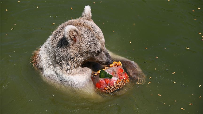 Sıcak nedeniyle iştahları kapanan hayvanlara beslenme alışkanlıklarına göre hazırlanan yiyecekler, buz kalıplarında dondurularak servis ediliyor. Bu sayede park sakinleri, buzlu meyveleri yiyerek hem karınlarını doyuruyor hem de serinliyor.