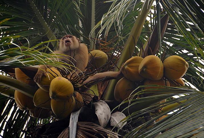 Boyunlarına bağladıkları ip sayesinde kaçması önlenen maymun, kısa sürede tırmandığı ağaçtaki Hindistan cevizlerinin olgunlaşmış olanlarını diğerlerinden ayırt ederek koparıp aşağıya atıyor.