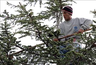 İşini bitiren maymunun aynı hızla ağaçtan inmesinin ardından yerdeki meyveler toplanıyor.