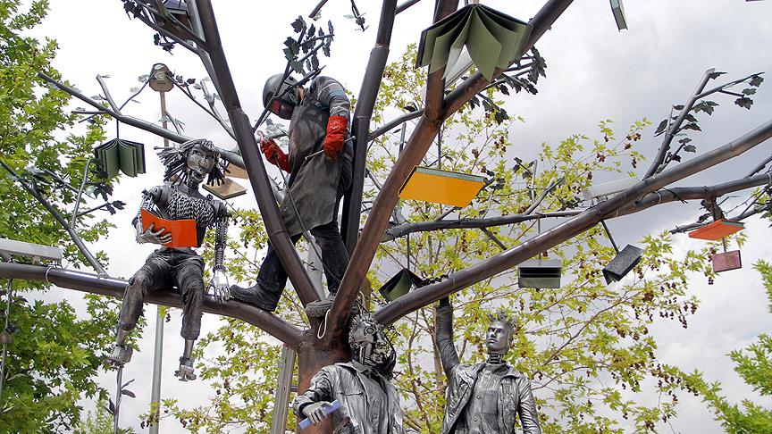 Elazığ'da yaşayan bir akademisyenin kitap okumanın önemine dikkati çekmek için hurda kamyon ve otomobil parçalarından oluşturduğu 10 metre yüksekliğindeki ağaç şeklindeki eser beğeni topluyor.