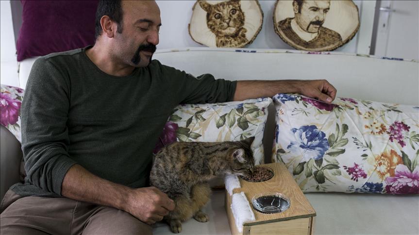Sokakta sağ ön bacağı kesilmiş halde bulduğu bir aylık kedinin tüm tedavilerini yaptıran ahşap ustası Osman Kaplan, sahiplendiği sakat kedinin evde rahat yaşaması için mama masası, merdiven ve pek çok araç gereç yaptı.