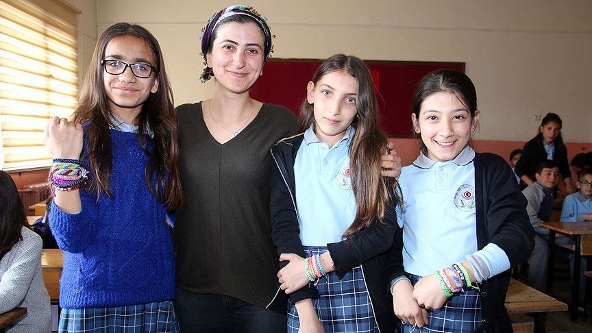 Sivas'ın Şarkışla ilçesindeki Şehit Tuncer Çeliker Bölge Yatılı Ortaokulu'nda eğitim gören 75 öğrenci, matematik öğretmenleri Tuğba Can öncülüğünde ders dışındaki zamanlarında bileklik ve kolye örüyor.