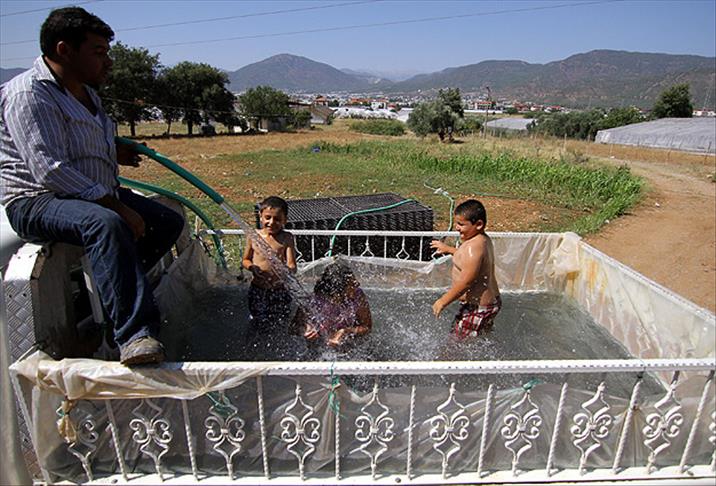Naylon brandayla kapladığı kasayı suyla dolduran Boyacı ve ailesi, "mobil havuz" sayesinde her gittikleri yerde ücretsiz serinleme imkanı buluyor.